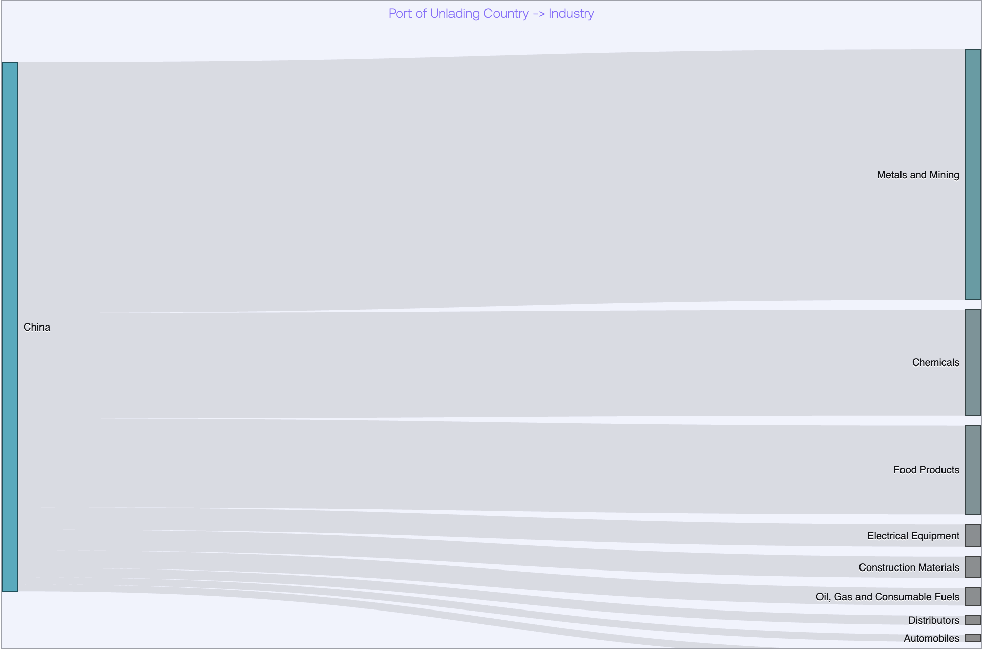 Industry mapping of Chinese sulphuric acid shippers to consignee industries confirms the cross-sector exposure. Metals and Mining is the dominant receiving industry by volume, followed by Chemicals and Food Products (reflecting fertilizer demand). Electrical Equipment, Construction Materials, Oil and Gas, Distributors, and Automobiles round out the top consignee industries, illustrating how acid supply constraints cascade from primary extraction through manufacturing and infrastructure.