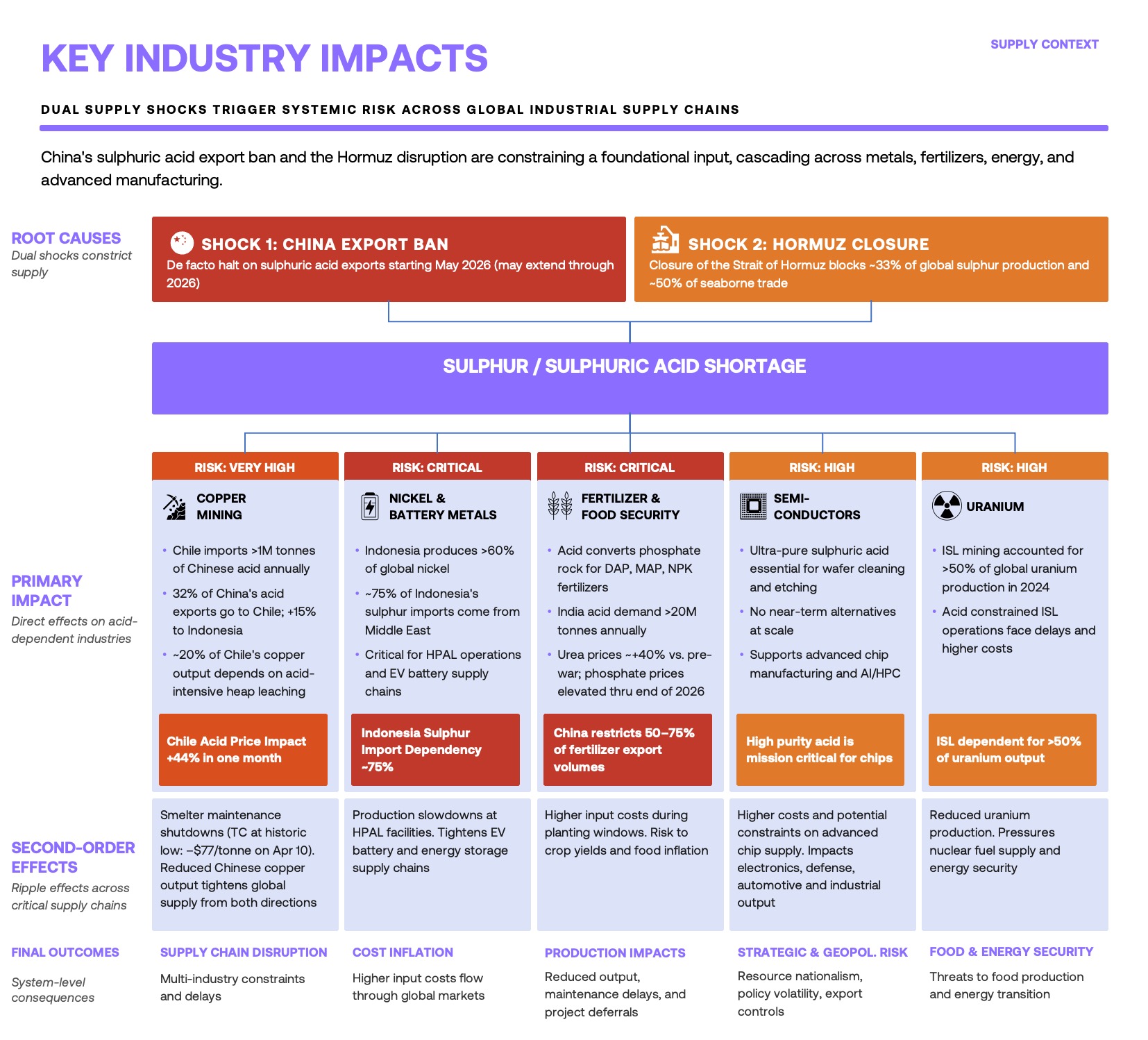 • Cross-sector impact: Acid-dependent industries—including copper, nickel, fertilizers, semiconductors, and uranium—face immediate disruption with cascading second-order effects.