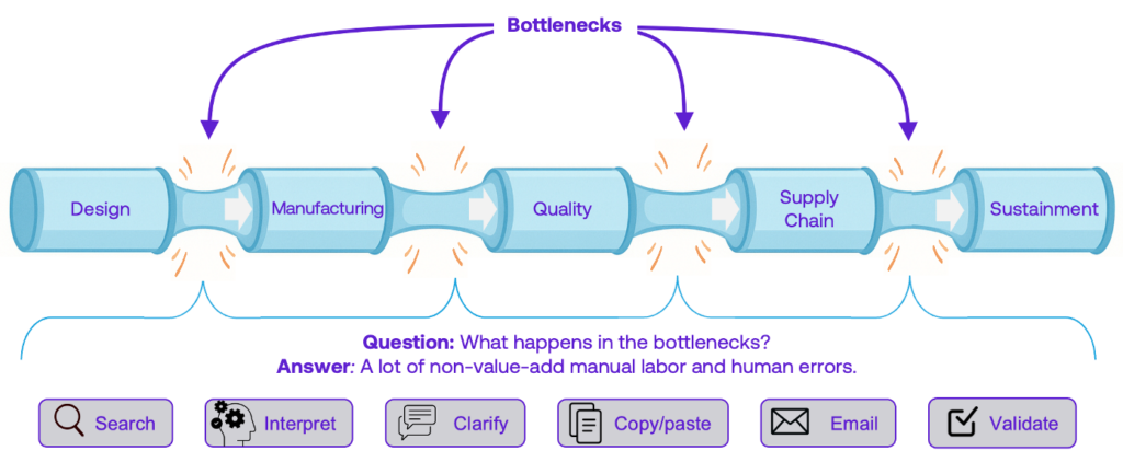 That cost rarely shows up as one big bill or on one single line item. Instead, it accumulates as a hidden tax across multiple departments: engineering hours lost to document chasing and manual re-keying; extended change-to-release cycles; late surprises that become scrap and rework; supplier lag while people interpret emails and attachments; procurement emergencies when materials are scarce or suppliers do not come through; NCRs; and compliance headaches. What looks like small behaviors – copy/paste, searching drawing notes for regulated materials, and manual interpretation – often compounds into real schedule slip and operational risk.