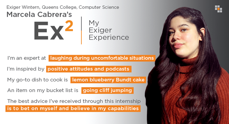 Marcela Cabrera was one of five talented young women who joined us to accelerate her future in tech. To learn more about how we’re working to close the gender gap and committing to International Women’s Day 2020’s #EachforEqual pledge, read on for Humayra’s Exiger Experience.